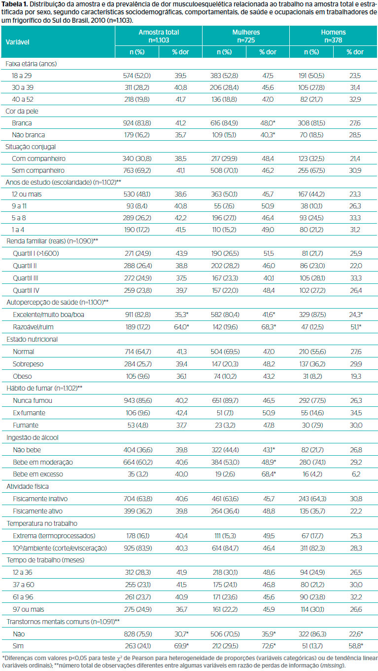 Na Tabela 1 são apresentados os resultados encontrados para a prevalência de dor musculoesquelética relacionada ao trabalho na amostra total de trabalhadores. Os dados são estratificados por sexo, segundo características sociodemográficas, comportamentais, de saúde e ocupacionais. Viu-se prevalência significativamente maior de dor musculoesquelética entre os trabalhadores que consideravam a sua saúde razoável ou ruim (percepção negativa de saúde), sendo esse resultado similar tanto nos homens quanto nas mulheres. Verificou-se, também, maior prevalência de dor musculoesquelética entre as mulheres de pele de cor branca e entre aquelas que relataram maior consumo de bebidas alcoólicas.