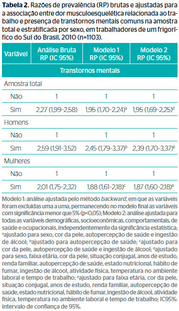 Com os objetivos de verificar e demonstrar consistência para a associação entre transtornos mentais comuns e dor musculoesquelética relacionada ao trabalho, a análise ajustada (multivariável) deu-se mediante dois modelos. No primeiro, fez-se a análise backward , na qual as variáveis demográficas, socioeconômicas, comportamentais, de saúde e ocupacionais coletadas no estudo e consideradas potenciais fatores de confusão para a associação principal foram excluídas uma a uma, permanecendo no modelo final apenas as variáveis com significância estatística menor que 5% (sexo, cor da pele, autopercepção de saúde e ingestão de álcool). No segundo modelo, o efeito da variável de presença de transtornos mentais comuns sobre a ocorrência de dor musculoesquelética foi controlado para todas as variáveis demográficas, socioeconômicas, comportamentais, de saúde e ocupacionais, independentemente da significância estatística. As análises foram exploradas pensando na amostra total de trabalhadores e estratificada por sexo.